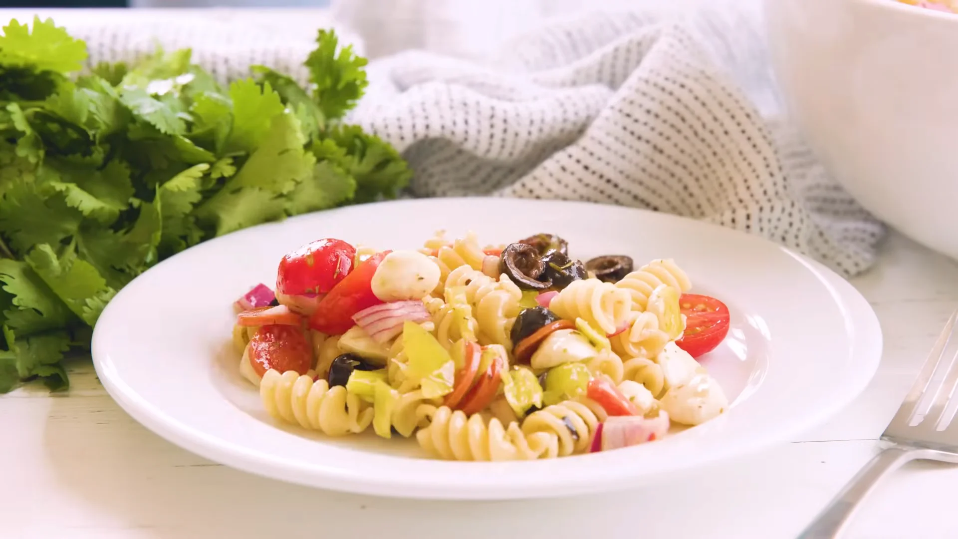 1.12 oz pasta (rotini, penne, or bowtie work well)2.1 cup cherry tomatoes, halved3.1/2 cup cucumber, diced4.1/2 cup red onion, thinly sliced